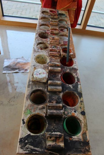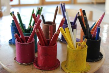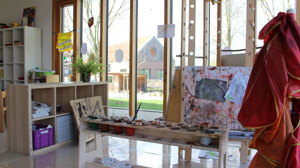 Eine unserer Gruppen ist als Atelier gestaltet, in dem die Kinder ihrer Kreativität freien Lauf lassen und mit unterschiedlichen Materialien arbeiten können.
